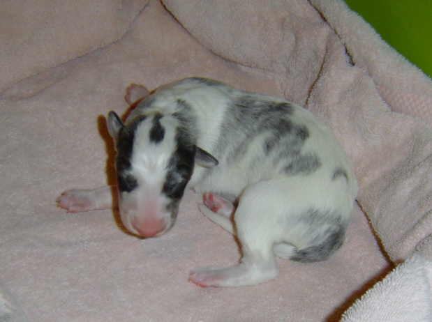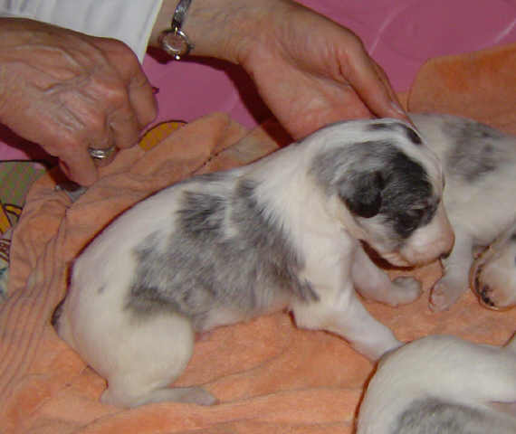 Diego 4/19/10Diego (on top) & Mira 4/19/10Puppies pictured above 4/19/10 @ 2 weeks old.![]()