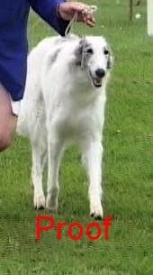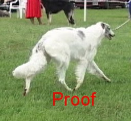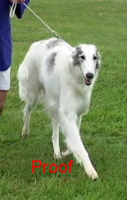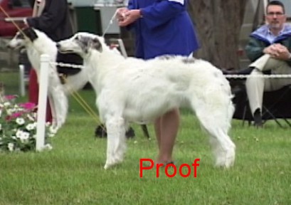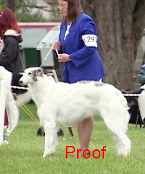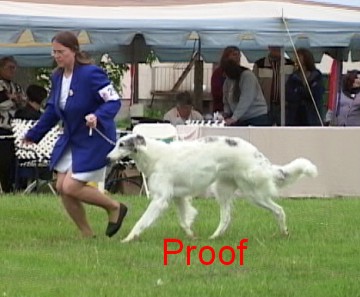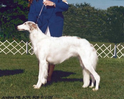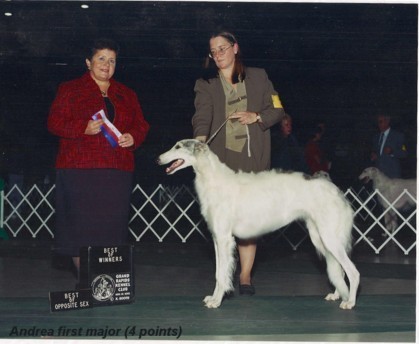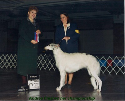 Andrea pictured above 6/10/05 after winning an AOM at the Greater Twin Cities Borzoi Specialty under Judge: Ms. Lena Tamboer with daughter Rachel showing her.