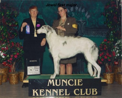 Jewel's Photo Album![]() Jewel goes WB for a 3 point major at Delaware Kennel Club, Ohio 10/25/03 to finish her Championship. Pictured above with Judge: Mrs. Susan Carr.Jewel picks up her first major at Muncie Kennel Club, IN 2/2/03 under breeder Judge: Ms. Jan Leikam.