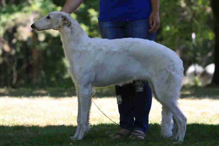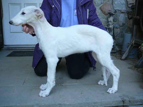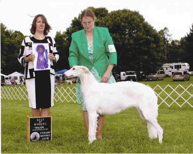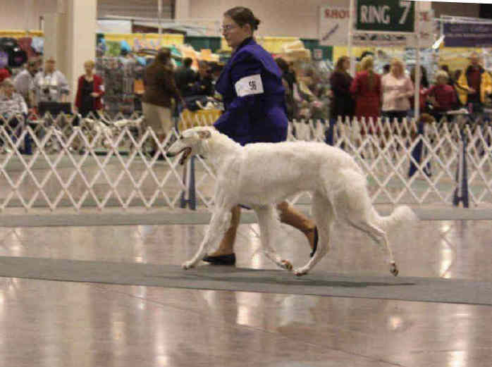 Photo by Donna KempMcKenna pictured above moving, (on down & back. She went on to go WB for a 4 point major at the Midwest Borzoi Club Specialty under Ms Henri Goldner.![]() McKenna's second weekend out showing, she is WB, BOW from the 6-9 month Puppy class, for a 5 point major under Judge Mrs. Rita Rice, at Cudahy Kennel Club 8/10/12 held in South Milwaukee, WI (BCOA Supported show). She also wins her Sweepstake class. Next day she wins her 6-9 month puppy class at Regular show and is 2nd in her 6-9 month puppy class at the MBC Specialty. She's 7 months old at these shows.![]() "McKenna" pictured at 6 months of age. Photo by Stuart McGraw. ![]() "McKenna" first time I held her at Majenkir Borzoi. She's 3 months old in this picture.![]()