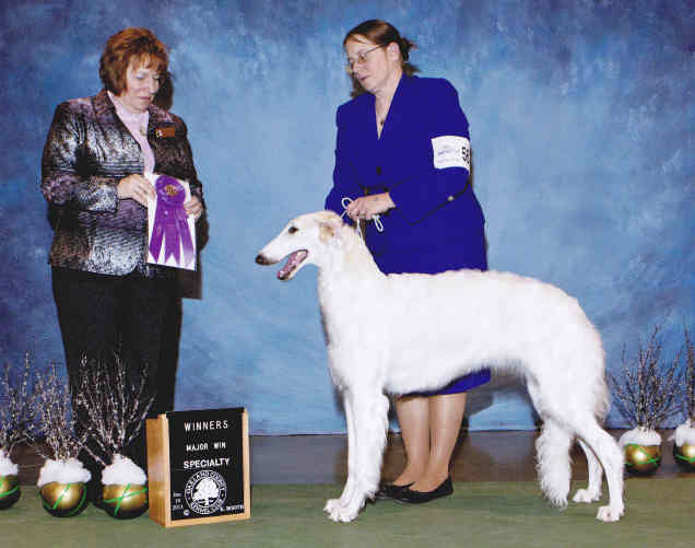 Copyright 2002-2099 Avalyn Manor"McKenna" is owned by Lynne Bennett, Barbaranne Benjamin and Karen Staudt-CartabonaMcKenna pictured above after going WB for a 4 point major at the Midwest Borzoi Club Specialty under Ms. Henri Goldner 1/19/13. This now gives McKenna 11 points with both majors at 1 year of age.